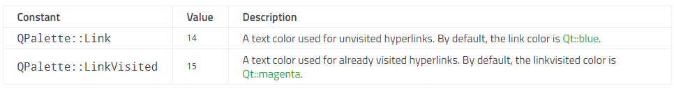 请注意,在Qt中渲染富文本时,我们不使用Link和LinkVisited角色,建议您使用CSS和QTextDocument::setDefaultStyleSheet()函数来更改链接的外观。例如: