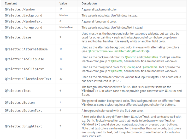 当您为窗口Widget分配新的调色板时,该调色板的颜色Role将与窗口Widget的默认调色板组合在一起,以形成窗口Widget的最终调色板。Widget的背景角色的调色板条目用于填充Widget的背景(请参阅QWidget :: autoFillBackground),而前景角色则初始化QPainter的笔。