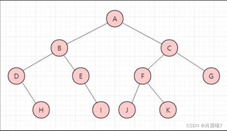 叶节点或终端节点:度为0的节点称为叶节点;如上图:H、I、J、K、G为叶节点