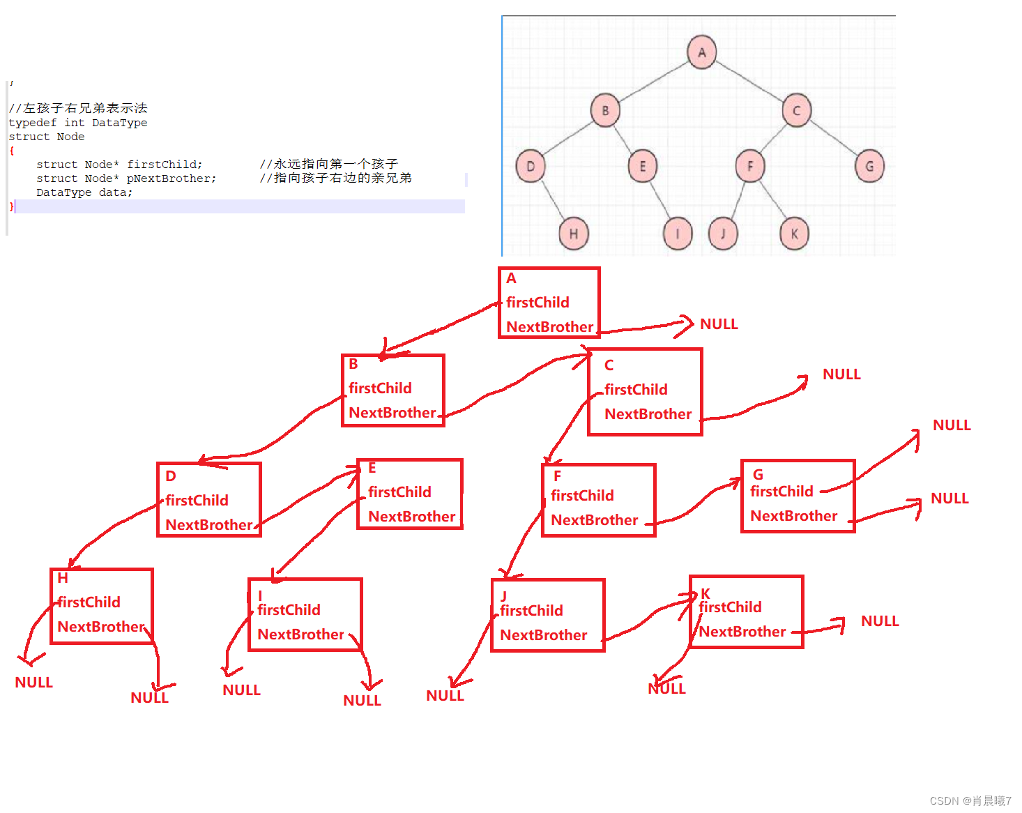 //左孩子右兄弟表示法 typedef int DataType struct Node { struct Node* firstChild; //永远指向第一个孩子 struct Node* pNextBrother; //指向孩子右边的亲兄弟 DataType data; }
