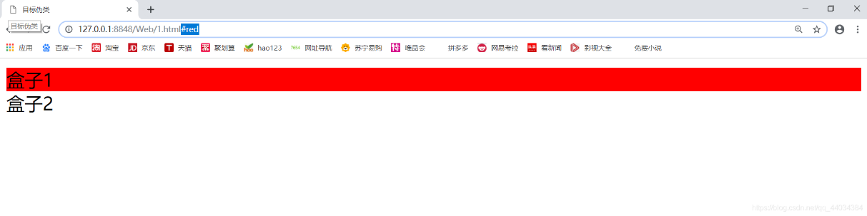 示例:针对以下文档,当在浏览器地址栏中输入 URL,并附加“#red”,以锚点方式链接到<div id="red">时,该元素会立即显示为红色背景,如下图所示: