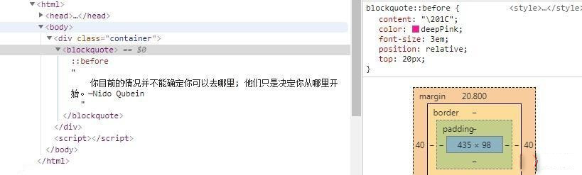 可以看出,添加有::before的内容与blockquote内的其他内容内联并位于其之前。