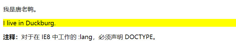 <p><b>注释:</b>对于在 IE8 中工作的 :lang,必须声明 DOCTYPE。</p>