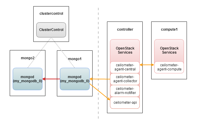 Ceilmeter通过收集CPU、网络、磁盘等计量数据,为openstack的计费提供支撑。因为需要大量的写操作,MongoDB成为数据库的首选。尽管具备其他后端数据库的驱动,但MongoDB仍被认为是功能完备的数据库。一个具备两个副本集的部署架构如下,