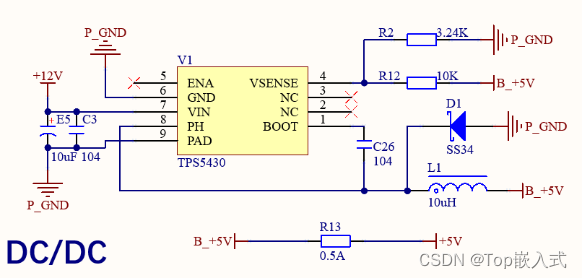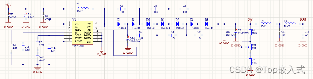 磁吸接口输入的12V电压需要降压到5V,以提供一个5V的电源电压,因为12V到5V的电压压差较大,所以使用DC-DC开关电源降压电路,以获取一个较大的电源转化效率,DC-DC降压电路采用TPS5430芯片,TPS5430是TI公司推出的一款典型的电源管理IC,其具有输出纹波小、散热性高等特点,适合为本课题的整个系统进行供电,TPS5430降压到5V电路原理图如下: