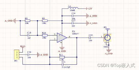 APD正常工作时,会将光强度转化为输出电流,需要引入IV转换电路,本项目中的 IV 转换电路采用TI公司的芯片OPA657,该运放芯片具有低噪声、高增益的特点,IV转换电路原理图如下: