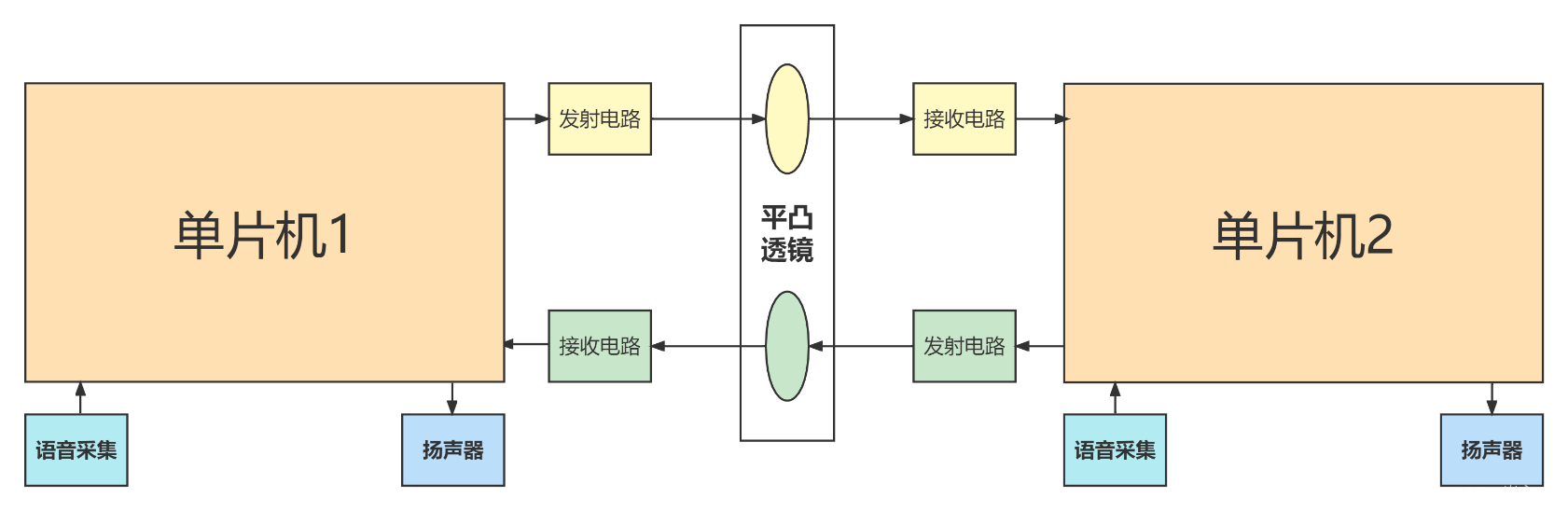 课题的主要目的是设计一对可见光语音通信原型机,通过可见光通信技术传递音频信息并播放,用于验证空间光通信的可行性。任务的主要设计内容为设计一对光信号收发装置,进行双工通信,将音频数据发送到另外一个设备进行播放,同时设置一个控制交互单元,用于控制发送的数据内容和接收的数据内容,整个系统运行一个简单的交互界面,便于用户进一步测试空间光通信的功能。