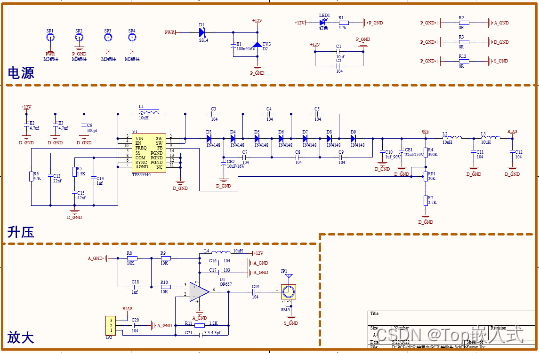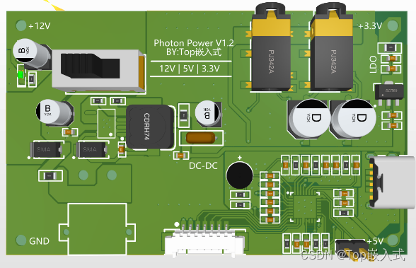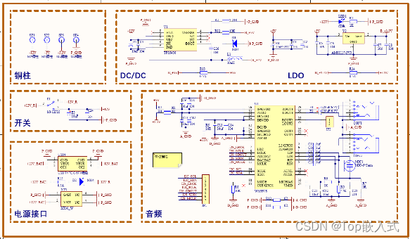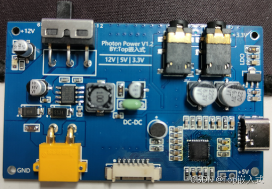 整个发射、接受、主控电路需要提供电源,为了方便调试,电源板单独分成一块PCB,通过与其他开发板连接的铜柱进行供电,电源板的电压输出分为12V、5V、3.3V以及GND,同时考虑到音频芯片对电源的要求较高,所以将音频芯片及其外围电路的设计放到电源板上,设计如下:
