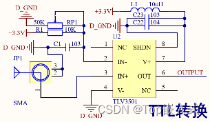STM32芯片的UART2接口则用于连接光通信电路进行通讯,控制核心电路包含一个单限比较器用于进一步将APD输出的信号进行阈值处理,使输入的信号符合TTL电平标准,能够被UART2识别到,具体的单限比较器电路如下,使用TI公司的TLV3501芯片作为运放比较芯片,TLV3201是单通道比较器,该电平转换快(40ns)且功耗低,支持轨对轨输入,低偏置电压只有1 mV,且具有大输出驱动电流等功能。 该芯片适合应用在响应时间要求较高的场景中,具体的设计电路如下: