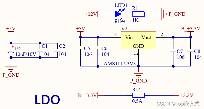 在通过降压获取到5V的电压后,电源电路还需要通过LDO将5V降压到3.3V,以获得3.3V的电压源为一些功能IC供电,此处的LDO线性降压电路使用AMS1117作为降压芯片,降压电路如下:
