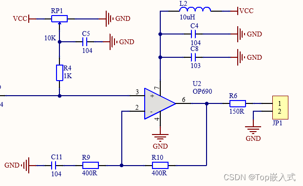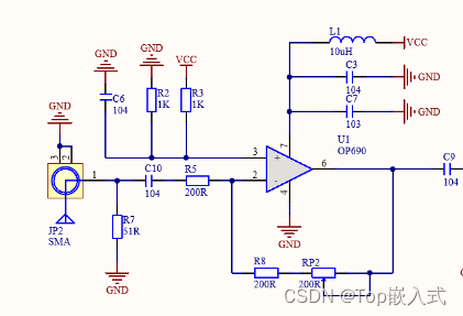 设计电路的采用TI公司的OP690作为运算放大器,该放大器的单位增益稳定,运放内部采用电压反馈,使用TI公司设计的内部结构提供转换速率,支持单电源供电,具有150ma的驱动电流以及150Mhz的带宽,适合高速IV转换电路。TTL信号输入后,经过R7和C10构成滤波电路,滤除输入信号的低频噪声,同时将输入的交流高频信号叠加到由R2和R3分压获得的参考直流电压上,防止输入信号失真。运放电路中的R5与R8加RP2的比值确定了电压的放大倍数,对输入的交流信号进行放大。