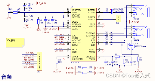 同时电源板集成了音频播放电路用于连接音响后播放音频,此处音频芯片采用的是欧盛公司的WM8978, WM8978是一款功耗低、播放质量高的立体声音频编解码芯片,专门为一些便携式音频场景的应用而设计,如数码相机、MP3、音响或数码摄像机等。 该芯片集成了差分立体前置麦克风放大器,输出端包括扬声器、耳机以及立体声输出驱动器,可以满足绝大部分音频播放需求;本项目的音频电路设计原理图如下:
