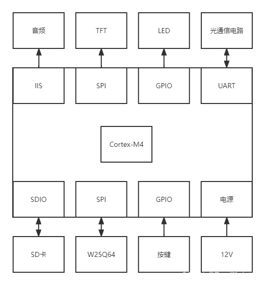核心处理电路用于为整个光通信系统提供硬件层支持,实现板载资源的基本控制和调度功能,该处理电路使用意法半导体的STM32F407VET6芯片作为核心,设计最小系统电路,同时为片上外设设计外围电路,实现其他必要功能,系统主控电路的整体设计框图如下: