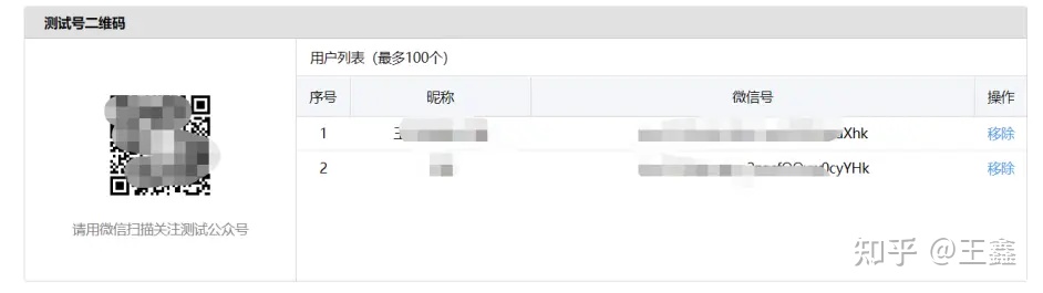 备注:这里有两种移除方式但愿小伙伴们都用不到,尤其是第二种!!!第一种服务端就是下图的移除按钮,第二种客户端就是取消关注该微信测试公众号。两种移除方式后就收不到消息了。