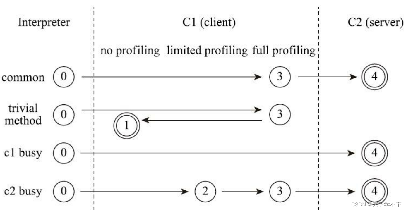 为了在程序启动响应速度与运行效率之间达到最佳平衡,分层编译根据编译器编译、优化的规模与耗时,划分出不同的编译层次,其中包括: