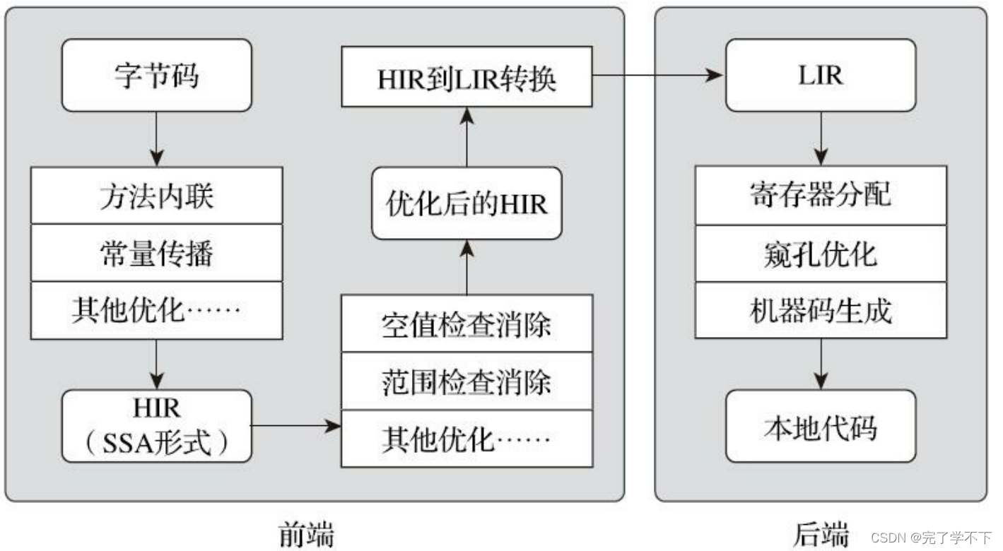 - 第二个阶段,一个平台相关的后端从HIR中产生低级中间代码表示(Low-Level Intermediate Representation,LIR,即与目标机器指令集相关的中间表示),而在此之前会在HIR上完成另外一些优 化,如空值检查消除、范围检查消除等,以便让HIR达到更高效的代码表示形式。
