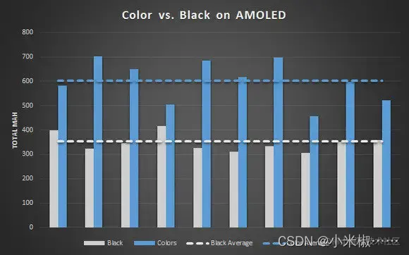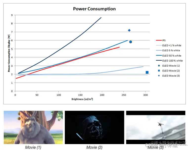 而对于亮度的优化,可以使得我们的功耗降低,节省手机有限的电量。上面左图可以看出,深色模式对电量的影响是很显著的。而同时在优化亮度的时候,我们也可以找出功耗与体验的平衡点,使得功耗低的时候,我们的体验感也是最好的。这一点可以在右图中看出。