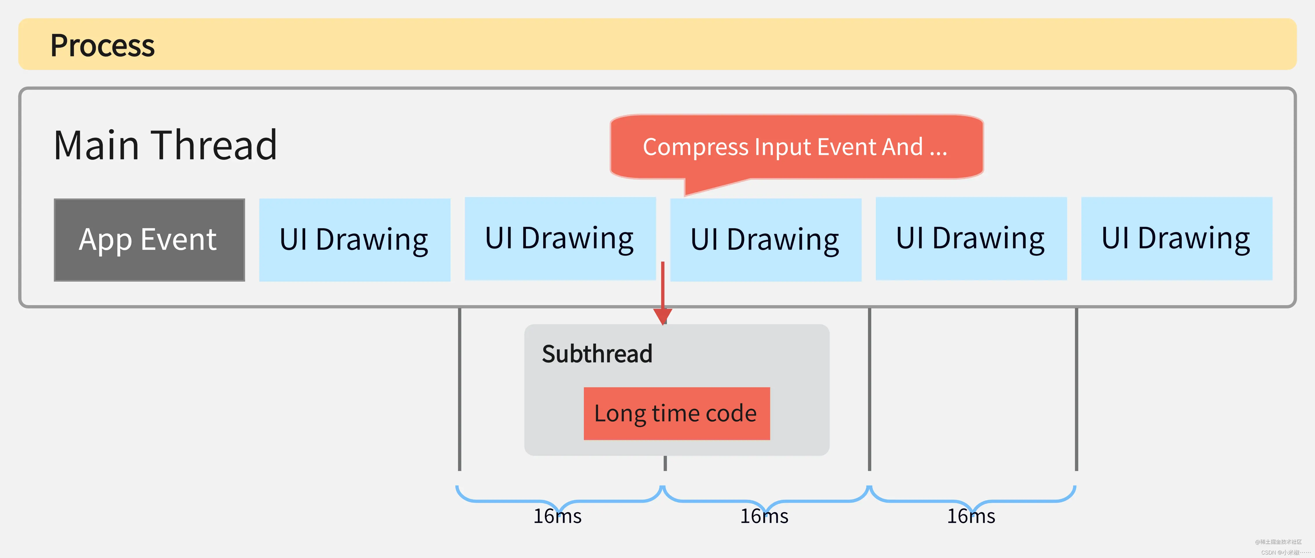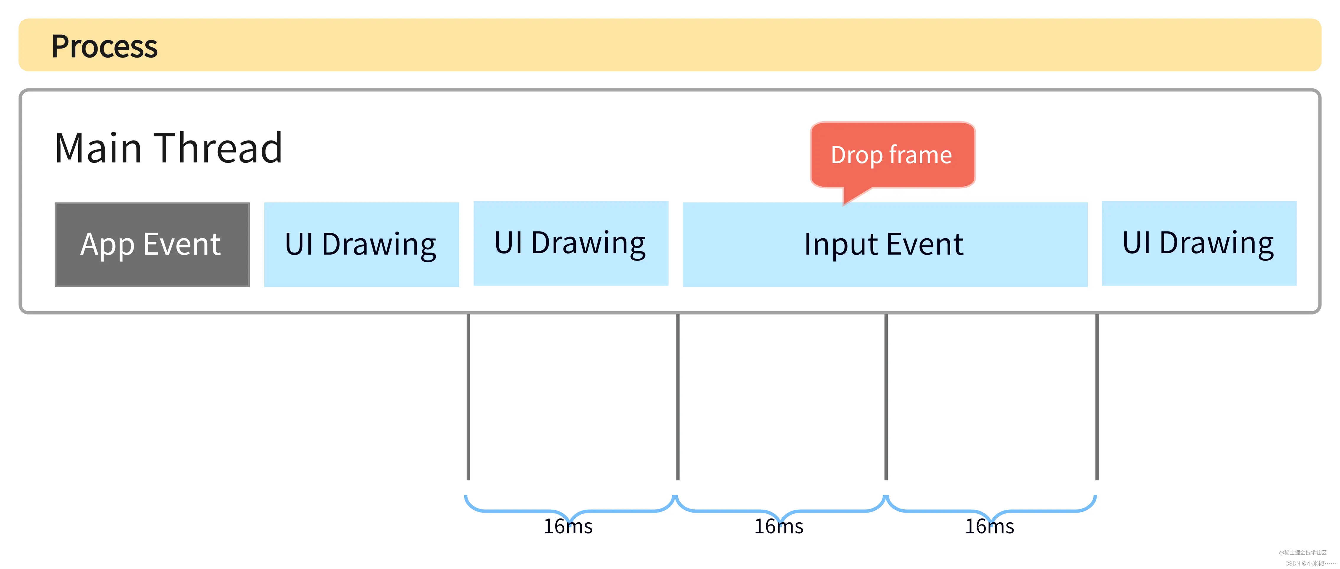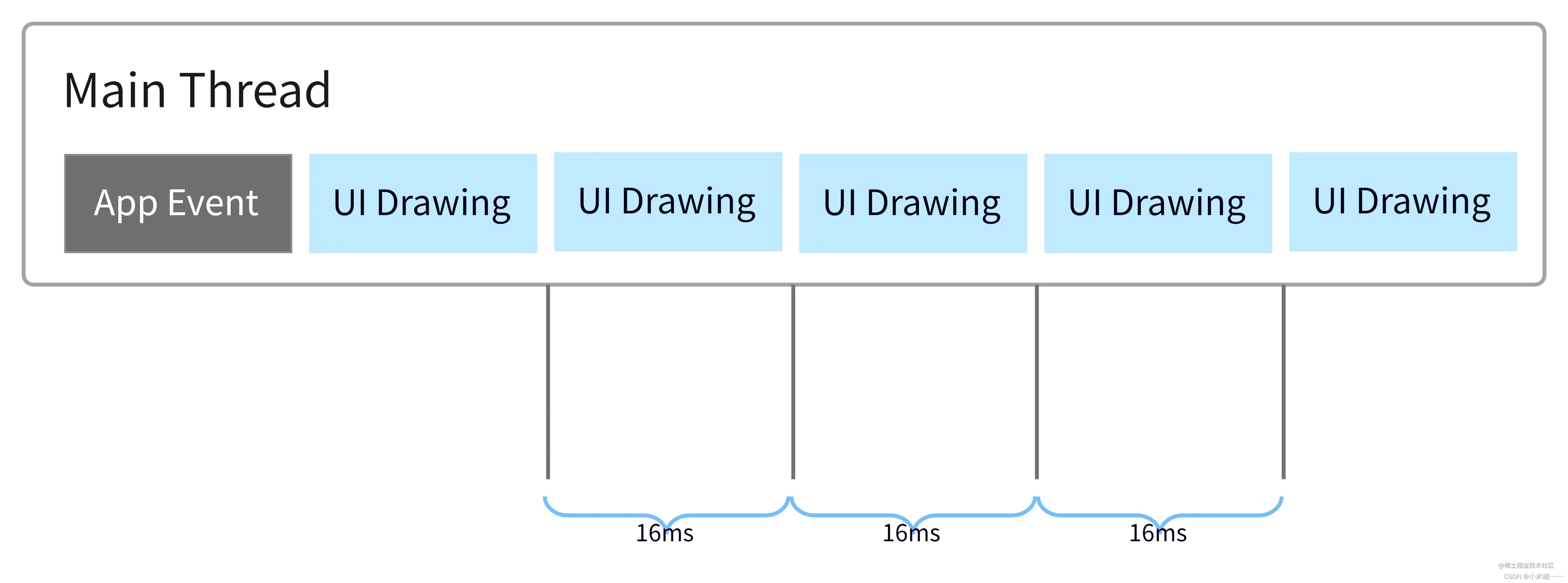 如下图,UI Draw 会在 16ms 就执行一次,所以我们的需要让我们的绘制流程在 16ms 内执行完才不会出现卡顿问题。