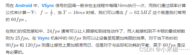 VSYNC 信号是由屏幕(显示设备)产生的,并且以 60fps 的固定频率发送给 Android 系统,Android 系统中的 SurfaceFlinger 接收发送的 VSYNC 信号。VSYNC 信号表明可对屏幕进行刷新而不会产生撕裂。