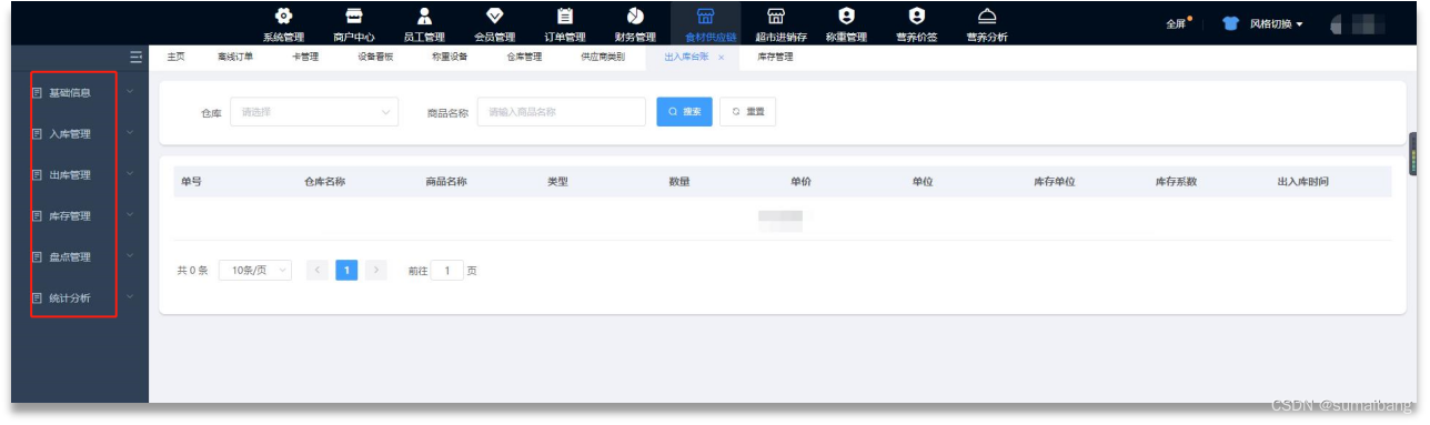 食材供应链系统后台设有供应商类别管理、仓库管理、出入库管理、库存管理等板块,严把食材来源,实现全流程数字化监控。