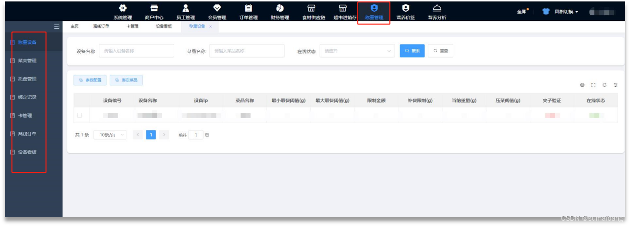 后台配置的称重管理系统,还可查看称重设备状态和管理顾客绑定的托盘,并且支持断网支付查看离线订单。