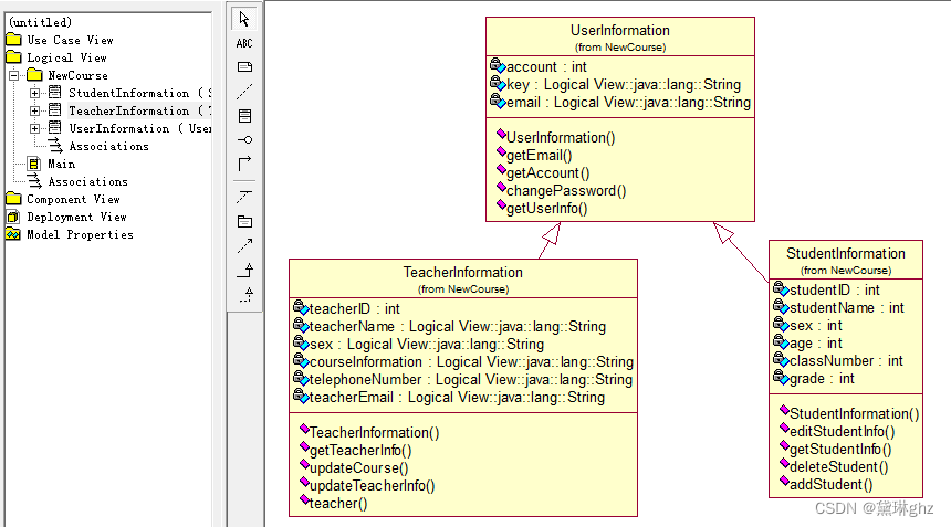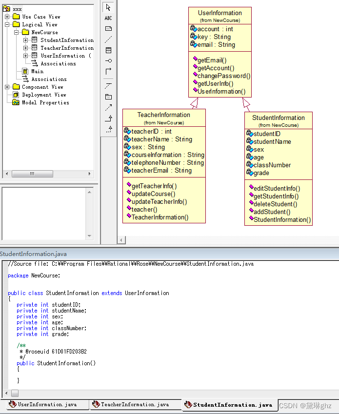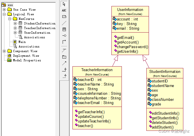 (1)首先选择“Tools”→“Options”→“Notation”→“Default”→“Java”,然后在Logical View上右键选择New→Package,将该包命名为“NewCourse”(不能用中文,也不能用数字命名),右键单击该包,添加三个类:UserInformation、TeacherInformation、StudentInformation,并分别为每个类添加属性和方法,保存文件为“xxx.mdl”,见图。