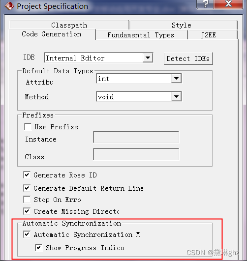(4) 设置“Code Generation”参数:选择“Tools”→“Java/J2EE”→“Project Specification”→“Code Generation”→“Automatic Synchronization”,它能够使代码与UML模型保持一致,每次创建或修改模型中的Java元素时,使代码自动生成(缺省时未设置同步)。