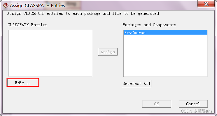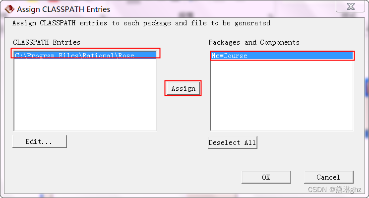 (6)选中类路径,单击Assign按钮,将Rose中的类部署到模型中的java组件中,然后单击OK,生成代码框架。