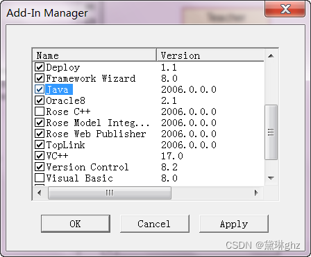 (2)设置语言插件:选择“Add-Ins”→“Add-Ins Manager”选项,选中所需语言名称“Java”,单击“OK”。如图。