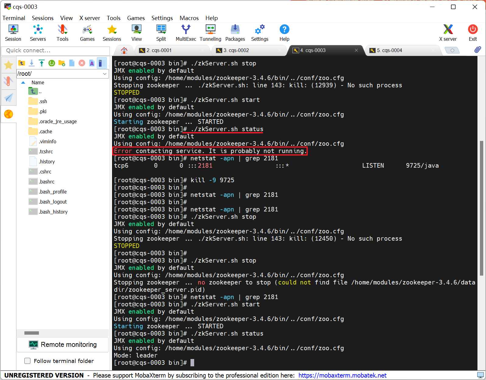 再输入检查命令,看是否有占用。若有继续删除,若没有则重新启动Zookeeper
