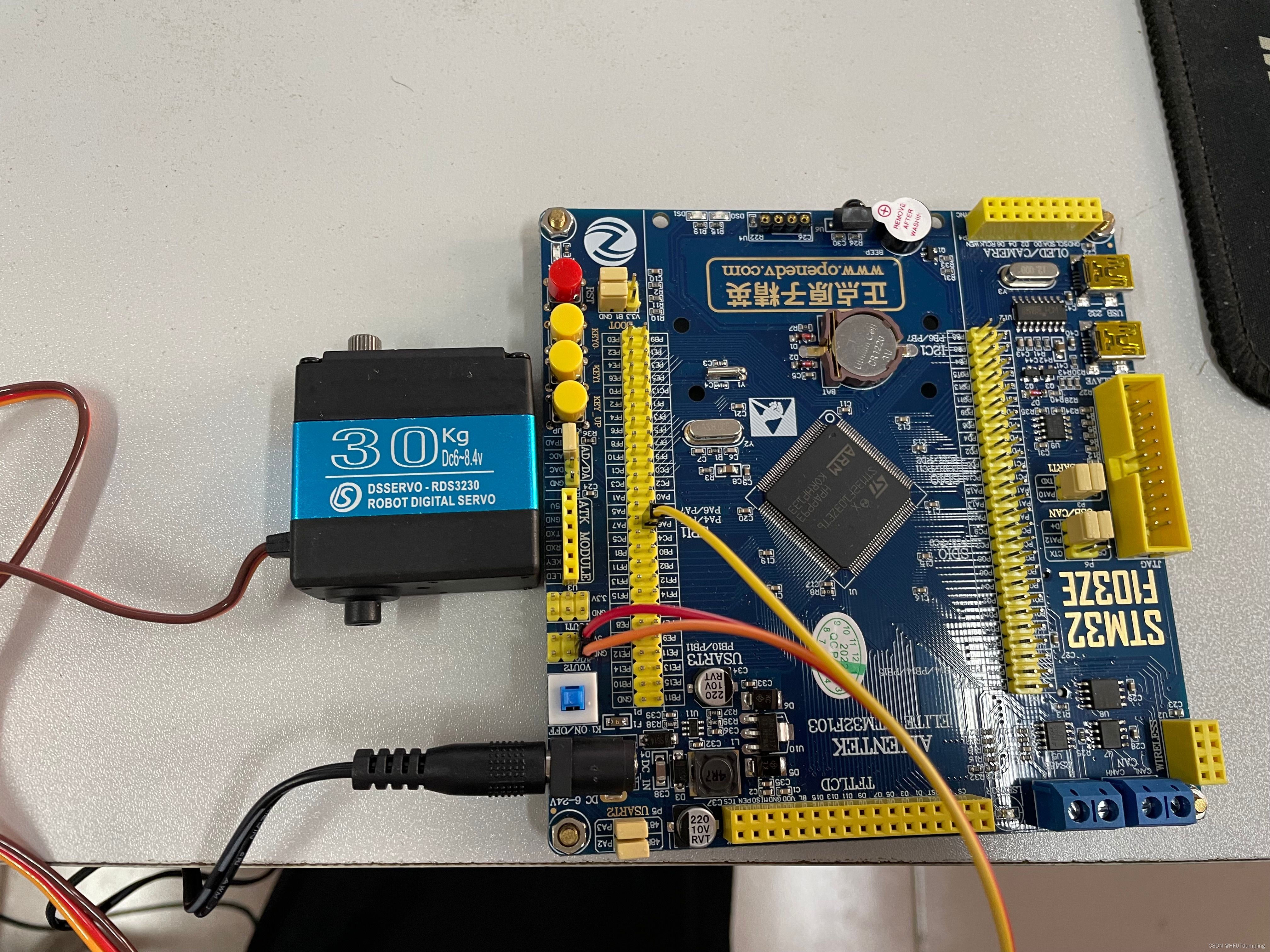 完成下载后,我们将舵机和32板子的线接好,并拔掉ST-LINK,开启外接电源(注意一定不要同时接两个电源,容易烧板子)。打开开关,舵机开始运行:每隔3s舵机转动135°,正转一次,反转一次。