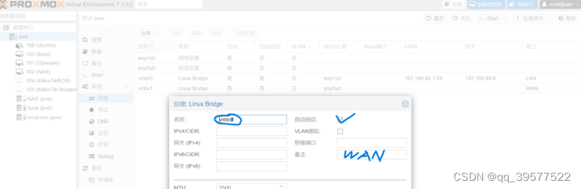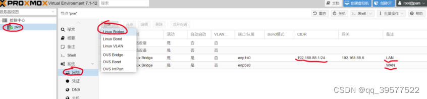 进入PVE后先创建网络桥接,将剩下的网口给到PVE节点。我这里只有一个剩下的网口,作为WAN口备注使用。