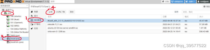 我下载的是64位的。下载完成后,将这个ISO文件上传到PVE,可以通过浏览器直接上传,点击PVE节点下面的Local盘符,点击右边选择ISO镜像,点上传,选择文件,上传。