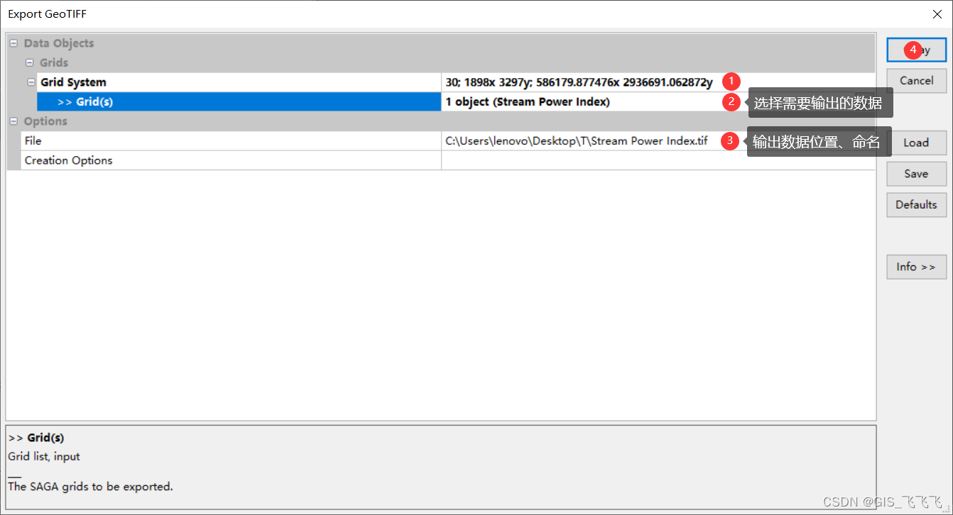 1.3 导出TWI数据,将其保存为TIFF格式。打开【Import/Export】—【GDAL/OGR】—【 Export GeoTIFF】工具。设置“Grid System”和“Elevation”参数,点击“Okay”,以下所有参数都会输出。