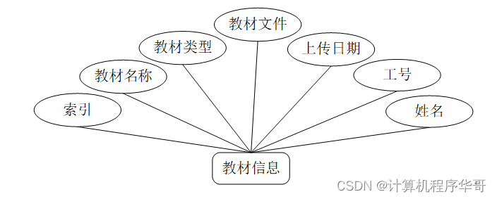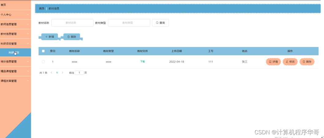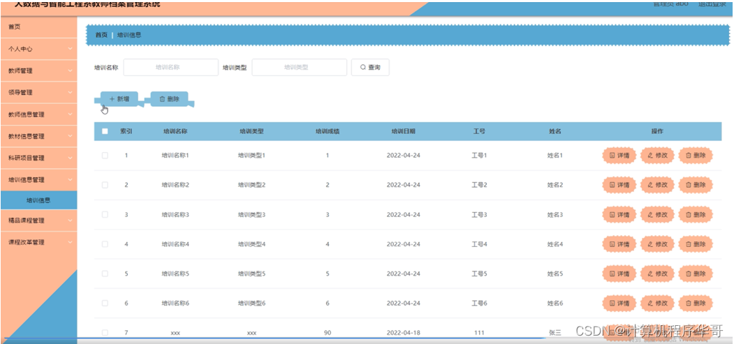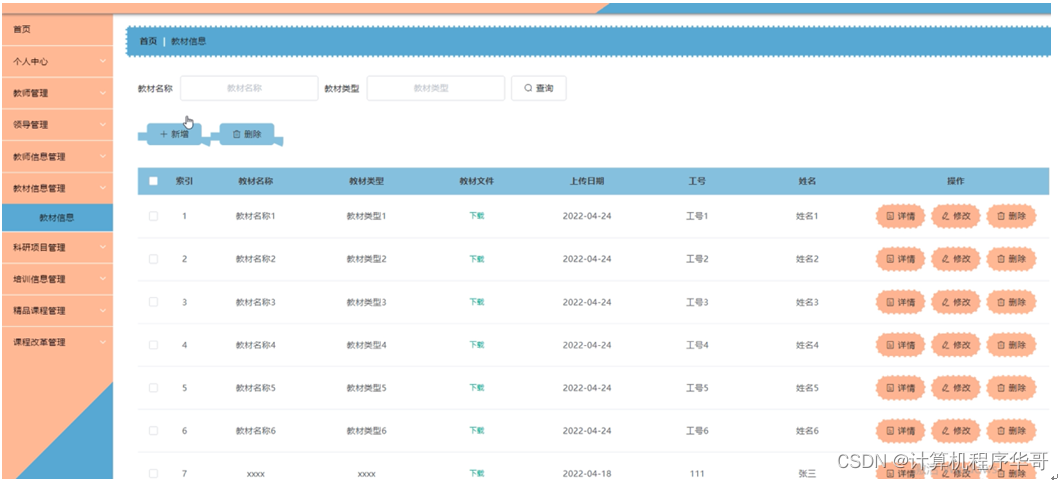 教材信息管理,在教材信息管理页面可以对索引、教材名称、教材类型、教材文件、上传日期、工号、姓名等内容进行详情、修改或删除等操作,如图5-7所示。