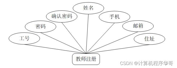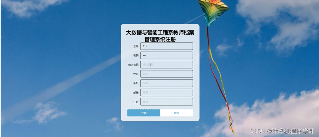 大数据与智能工程系教师档案管理系统,教师注册在页面填写工号、密码、确认密码、 姓名、手机、邮箱、住址等内容进行注册等操作;如图5-1所示。