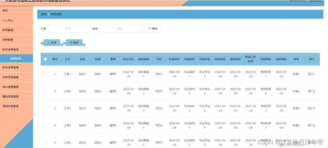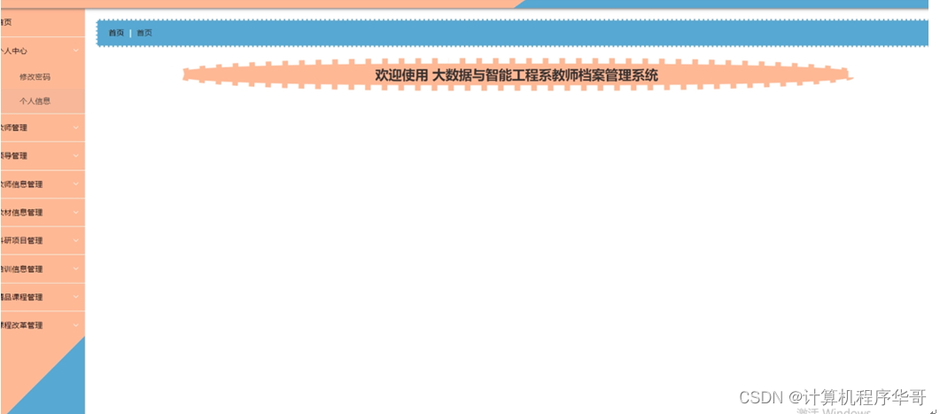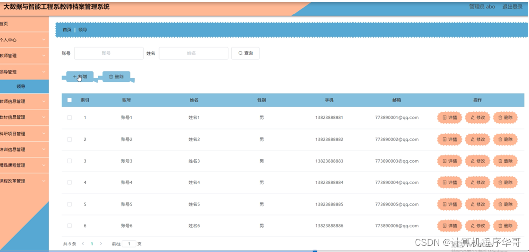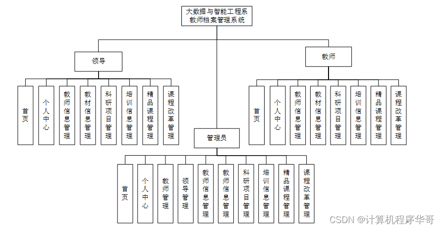 本课题要求实现一套大数据与智能工程系教师档案管理系统,系统主要包括(管理员、教师和领导)三个模块等功能。