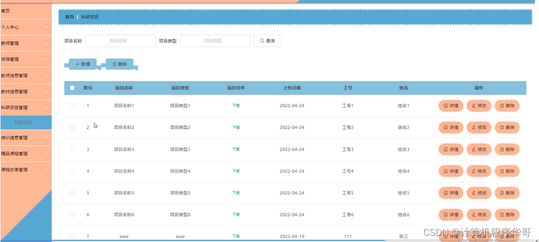 科研项目管理,在科研项目管理页面可以对索引、项目名称、项目类型、项目文件、上传日期、工号、姓名等内容进行详情、修改或删除等操作,删除等操作,如图5-8所示。