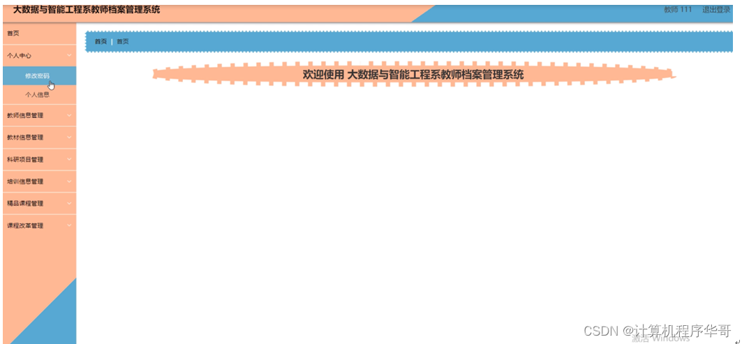 教师登录进入系统可以对首页、个人中心,教师信息管理、教材信息管理、科研项目管理、培训信息管理、精品课程管理、课程改革管理等功能进行相应操作,如图5-12所示。