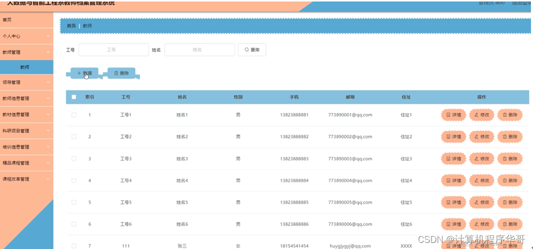 教师管理,在教师管理页面可以对索引、工号、姓名、性别、手机、邮箱、住址等内容进行详情、修改或删除等操作,如图5-4所示。