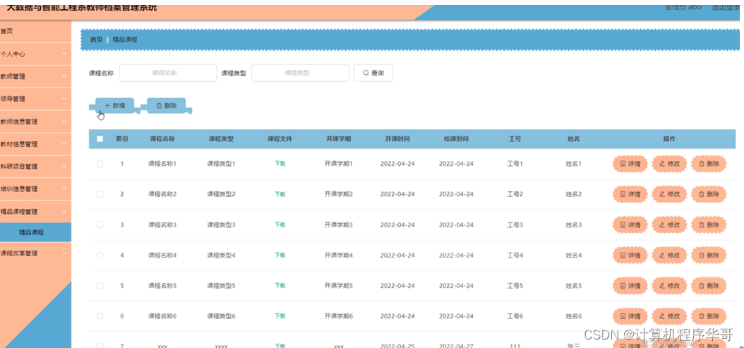 精品课程管理,在精品课程管理页面可以对索引、课程名称、课程类型、课程文件、开课学期、结课时间、工号、姓名等内容进行详情、修改或删除等操作,如图5-10所示。