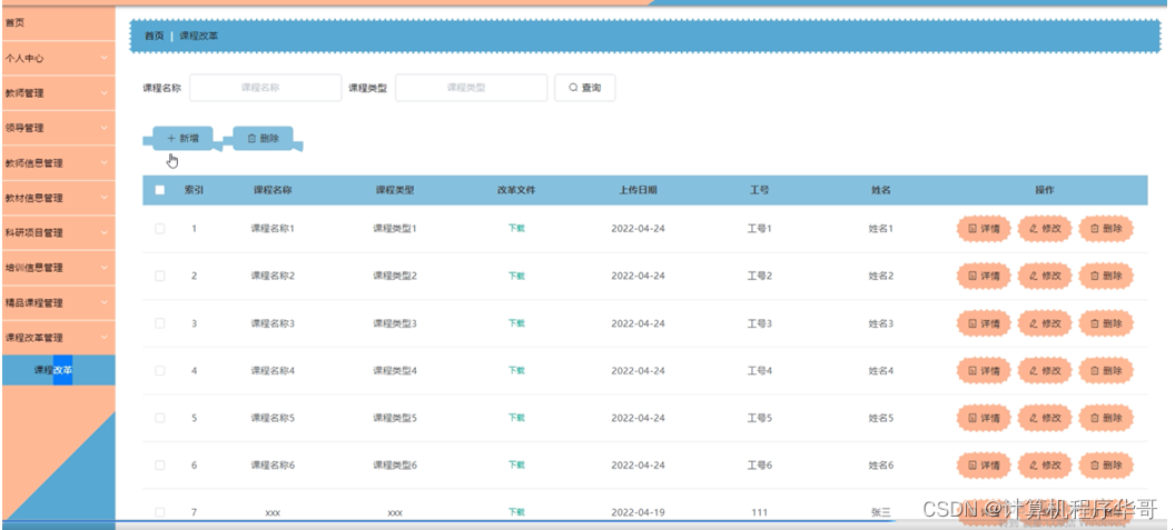 课程改革管理,在课程改革管理页面可以对索引、课程名称、课程类型、改革文件、上传日期、工号、姓名等内容进行详情、修改或删除等操作,如图5-11所示。