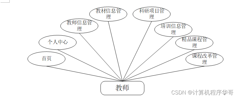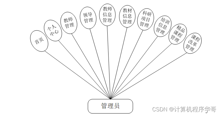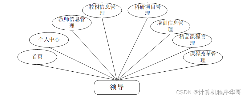 通过市场调研及咨询研究,了解了用户及管理者的使用需求,于是制定了管理员、教师和领导等模块。功能结构图如下所示: