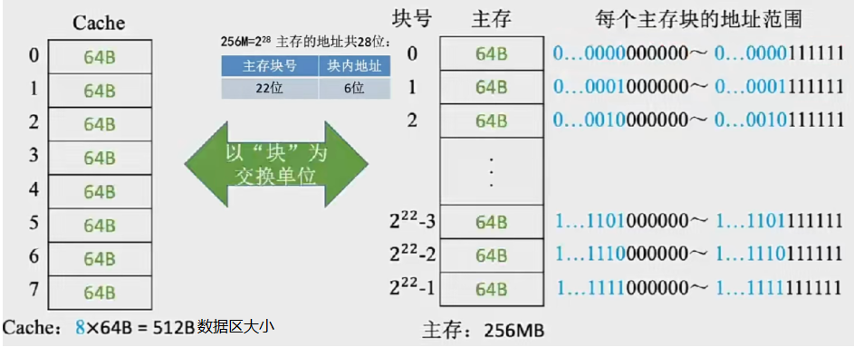 考虑到局部性原理,假设我们以内存中64B作为一个块,当访问这个块的某个地址时就把它写入Cache。具体对应关系如下: