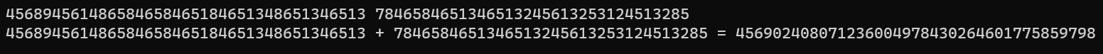 456894561486584658465184651348651346513 + 7846584651346513245613253124513285 = 456902408071236004978430264601775859798