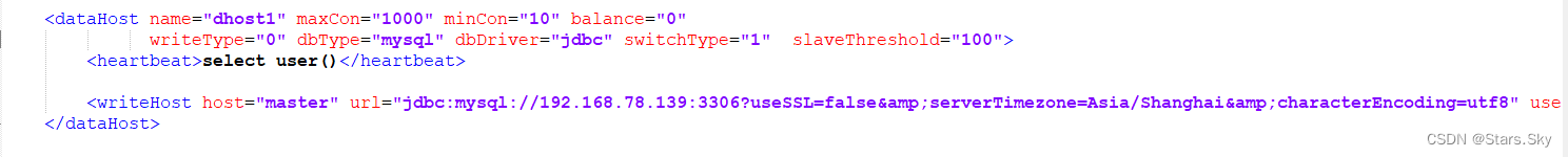 <writeHost host="master" url="jdbc:mysql://192.168.78.139:3306?useSSL=false&serverTimezone=Asia/Shanghai&characterEncoding=utf8" user="root" password="Qwe123456." />