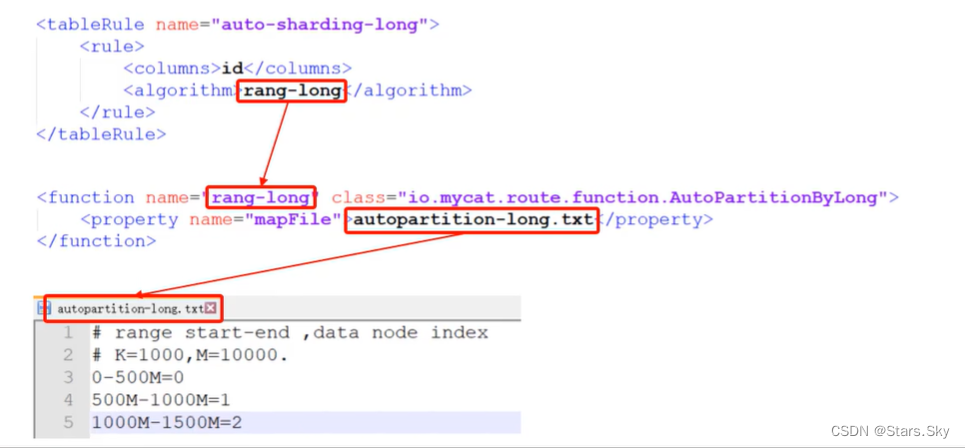 rule.xml中定义所有拆分表的规则, 在使用过程中可以灵活的使用分片算法, 或者对同一个分片算法使用不同的参数, 它让分片过程可配置化。主要包含两类标签:tableRule、Function。