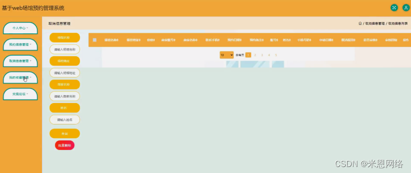 取消信息管理,会员可在取消信息管理页面查看场馆名称、场馆地址、价格、商家账号、商家名称、联系手机、预约日期、预约备注、账号、姓名、手机号码、申请日期、取消原因、是否审核、审核回复等内容,还可进行删除等操作,如图5-7所示。