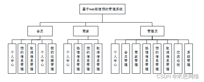 考虑到实际生活中在场馆预约管理方面的需要以及对该系统认真的分析,将系统权限按管理员、会员和商家这三类涉及用户划分。