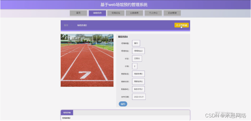场馆信息,会员可在场馆信息页面查看场馆名称、封面、场馆类型、场馆地址、状态、价格、商家账号、商家名称、联系手机、发布日期、场馆详情等内容,还可进行收藏或预约等操作,如图5-4所示。